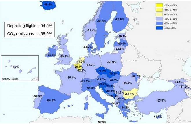 In 2020, aviation restrictions imposed to counter the COVID-19 pandemic have led to a 56.9% carbon dioxide reduction in Europe compared to the previous year, according to recently released Eurocontrol's data.