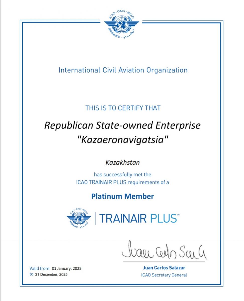 Статус PLATINUM предназначен для участников программы, играющих ведущую роль в регионе или на глобальном уровне, уделяющих особое внимание подготовке авиационного персонала. Сегодня РГП «Казаэронавигация» обладает не только сертифицированными ИКАО разработчиками курсов, а также инструкторами и валидаторами методологии курсов ИКАО.